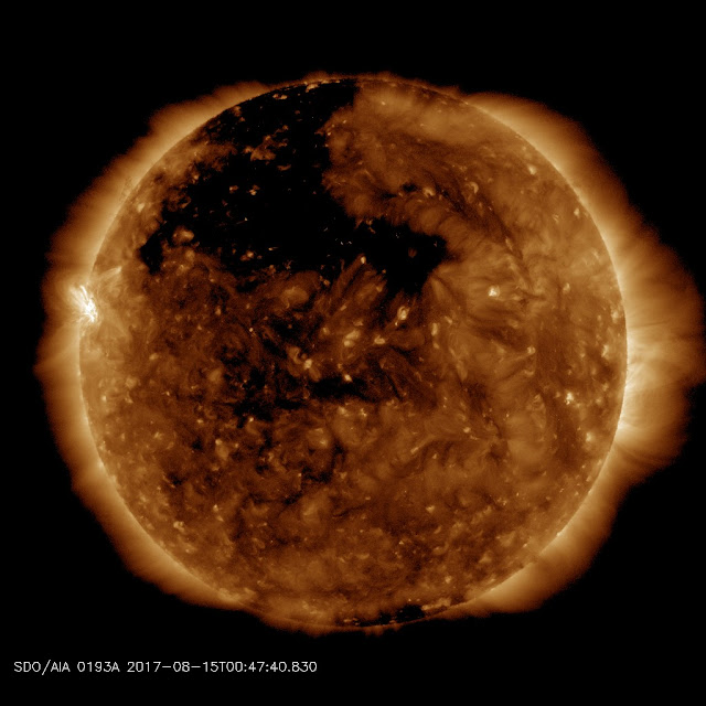 NOAA синоптики говорят, что вероятность того, что геомагнитные бури класса G1 16 августа возрастут до 55%, возрастет до 70% 17 августа, когда Земля переместится в поток быстро движущегося солнечного ветра.